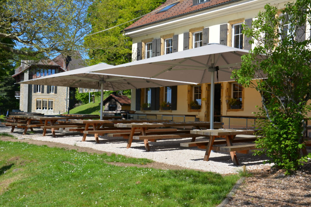 Grâce à l’aide financière de nos parrains et cotisants en 2024, nous avons pu installer deux grands parasols sur la terrasse et changer toutes les dalles de sécurité sur les places de jeux.